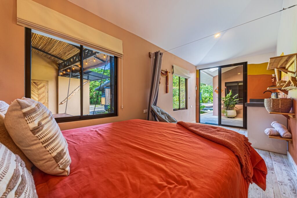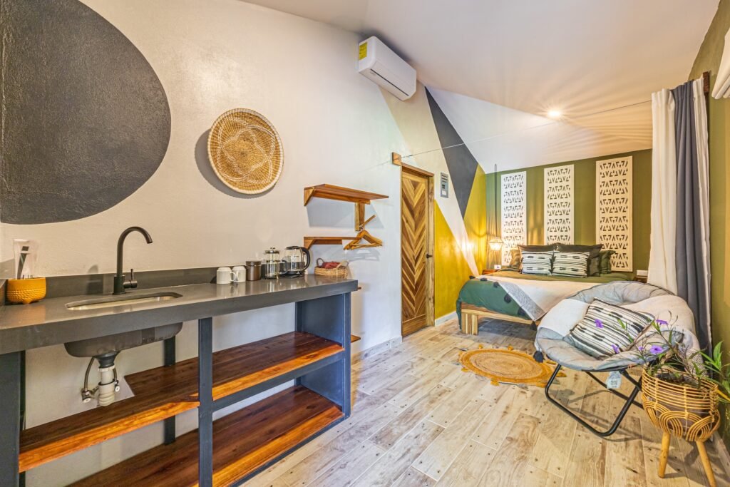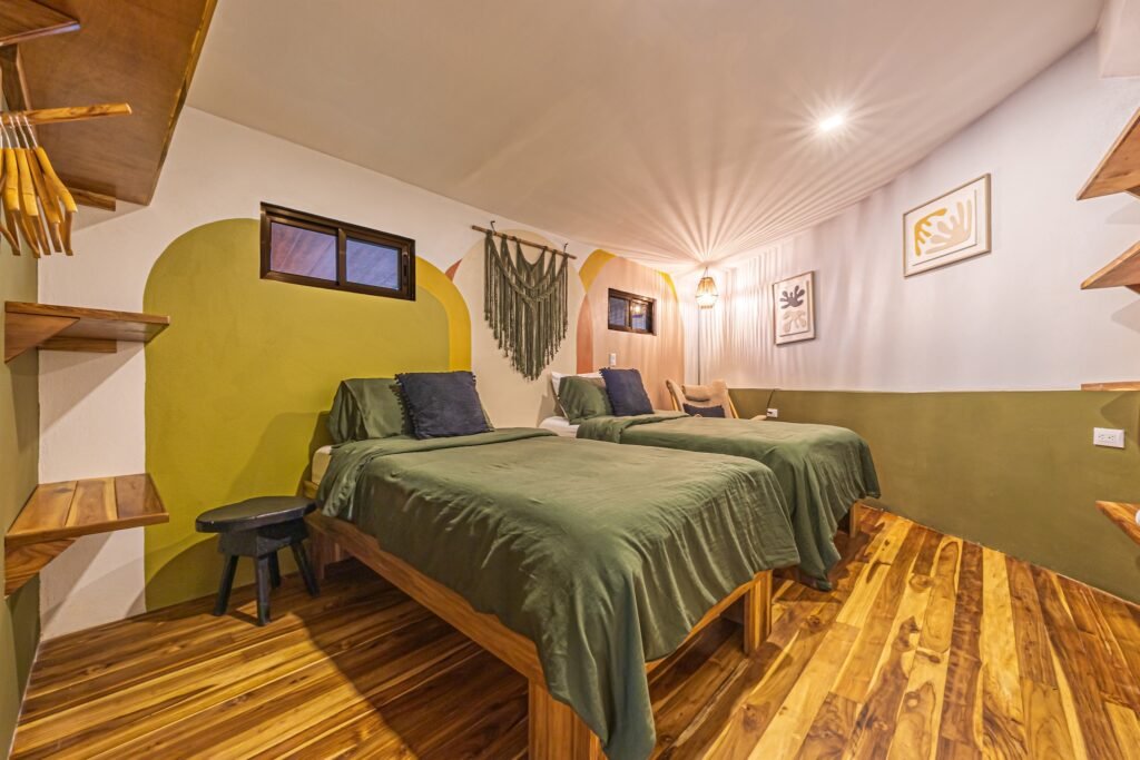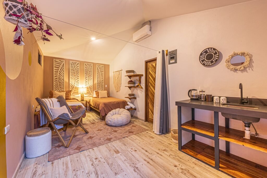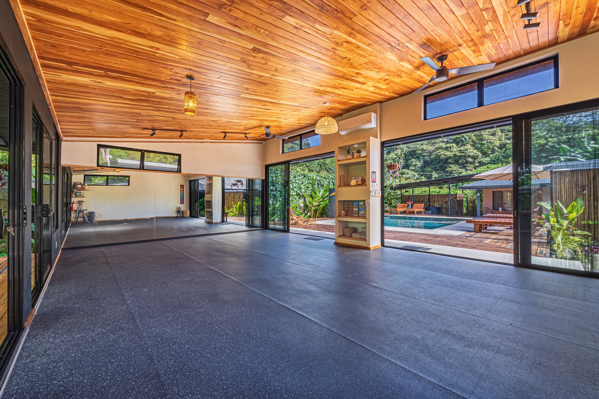 Our yoga room fits up to 25 mats and is designed for comfort and connection, with screened windows, eco rubber flooring, high teak ceilings, mirrors, and ceiling fans for an open-air feel—plus far-infrared heat for hot yoga classes or A/C when needed.