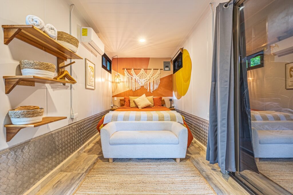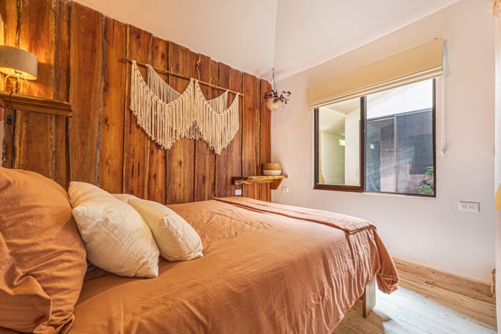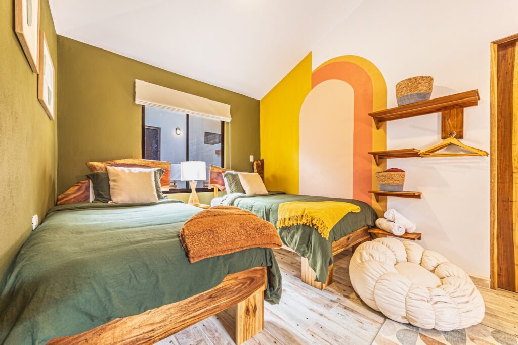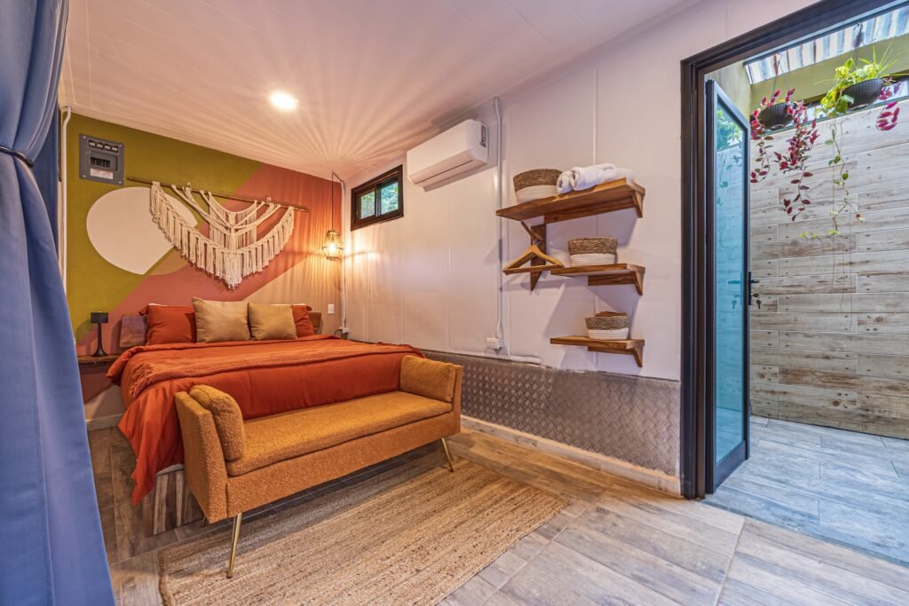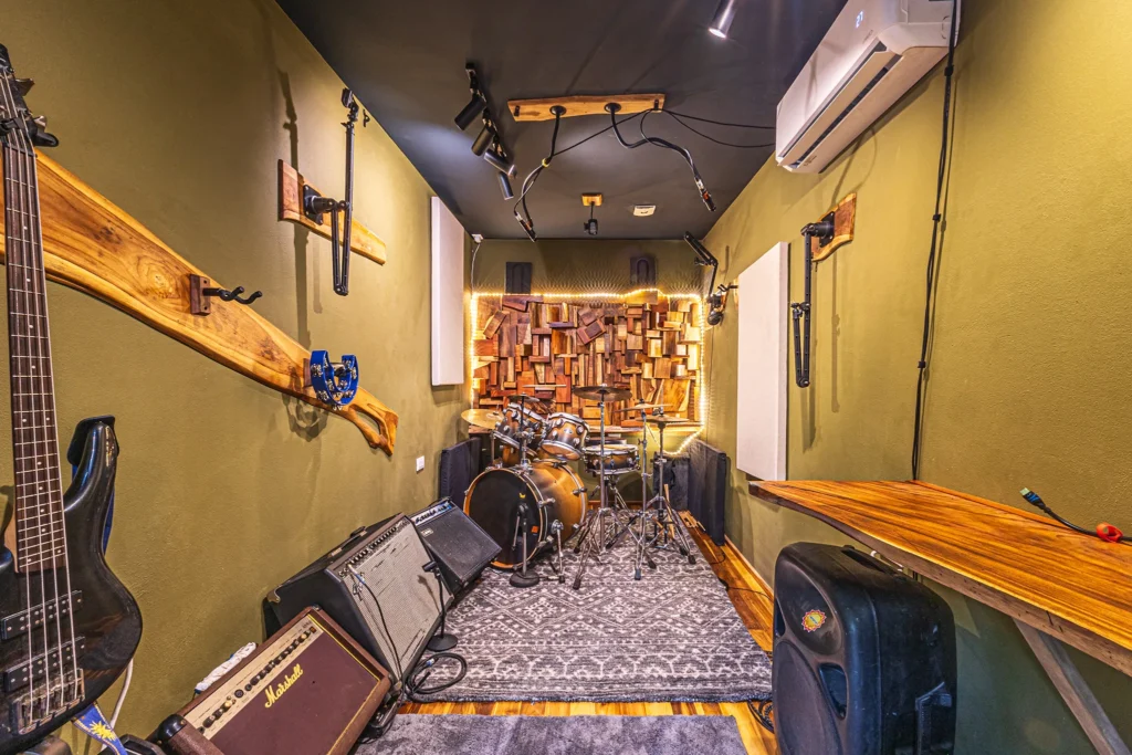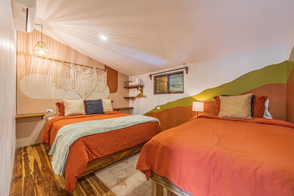 Our yoga room fits up to 25 mats and is designed for comfort and connection, with screened windows, eco rubber flooring, high teak ceilings, mirrors, and ceiling fans for an open-air feel—plus far-infrared heat for hot yoga classes or A/C when needed.